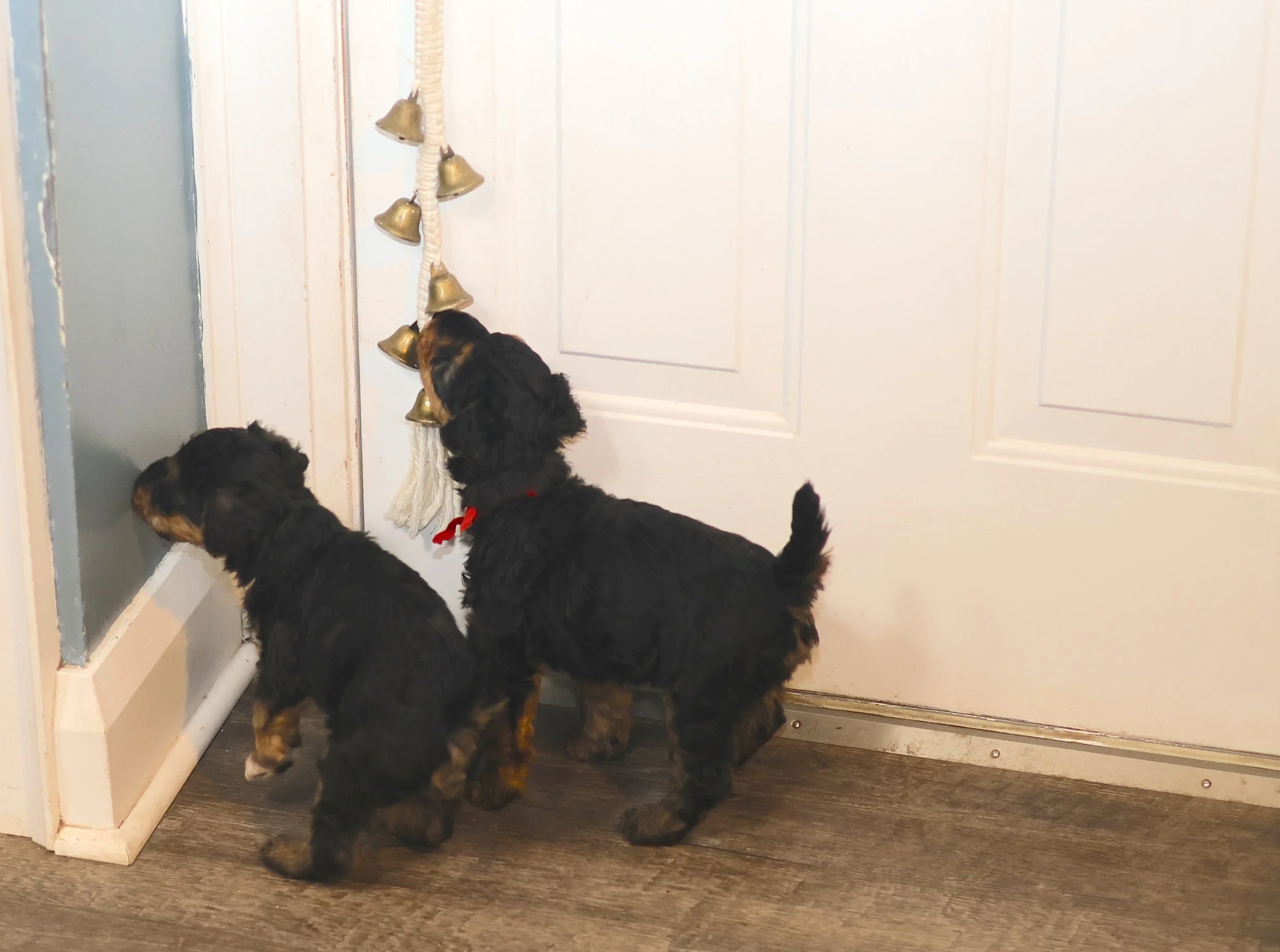 RING THE BELL TO GO OUT! Jan 11 Written By Chuck Stone The puppies are quckly learning to ring the bell on the outside door to ask to go outside. Chuck Stone